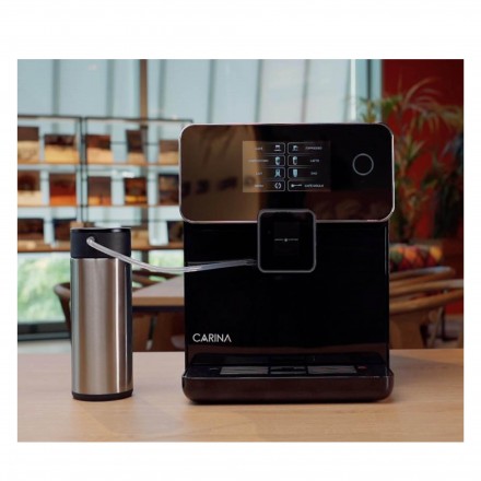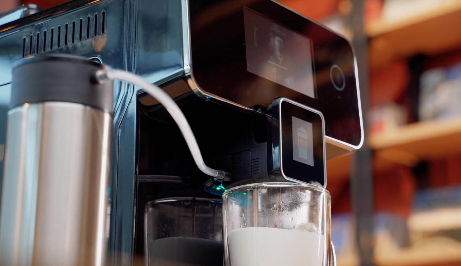 Réservoir de lait Full Latte de 500 ml de capacité, accessoire qui se connecte à la machine à café et qui peut aussi être rangé dans le réfrigérateur.